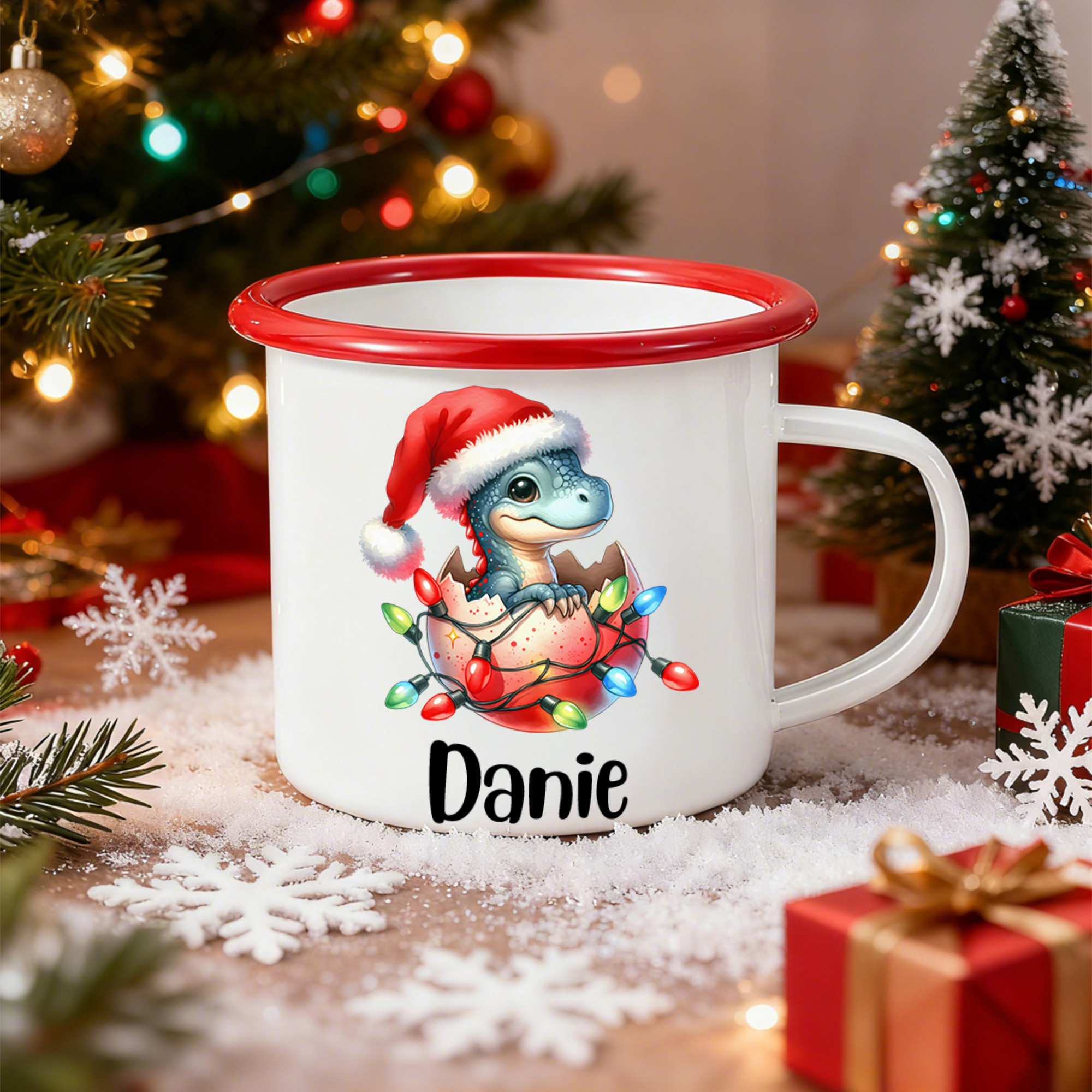Adorable Dinosaur Design - This enamel mug features a cheerful cartoon santa hatted dinosaur wrapped in glowing Christmas lights, bringing a playful and festive touch to every sip. Its bright multicolor artwork and cute expression capture the joyful spirit of the holidays, perfect for kids who love fun and dinosaurs.
