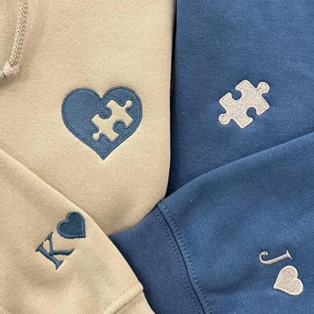 Personalized Initial Embroidered Heart and Puzzle Couple Shirt, Multicolor Crewneck Sweatshirt/Hoodie, Anniversary/Valentine's Day Gift for Him/Her
